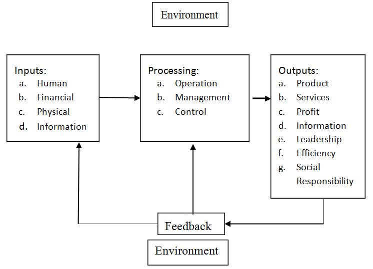 b. Organization as an Open System: Business Organization are perceive as open adaptive system. Any organism can be considered as an energy system which has inputs, transformation process and outputs. E.g. the inputs for a university would be students, teaching materials, books, money and so on. The transformation process would consist of lectures, seminars, assignments, research, study, discussion, counseling etc. The output would be educated, cultured and discipline individuals ready to enter the real world of business or employment. In general, the term system is applied to any activity or any collection of facts, ideas or principles which are so arranged as to present a united a whole. All operation of system will be methodical, thorough and regular and above all as per plan to achieve set objectives. In business many division and departments are organized on functional bases and all act as coordinated whole to achieve the basic objectives of the firm.